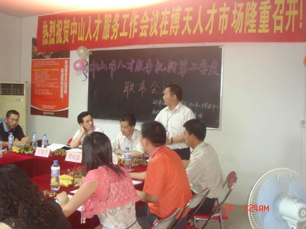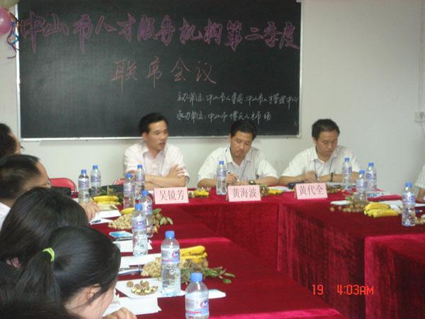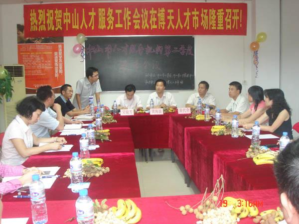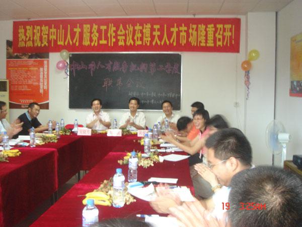 7月19日,市人事局、人才管理中心领导以及中山市人才服务机构各负责人到博天人才市场参加由市人事局、人才管理中心主办、博天人才市场承办的主题为“交流、规范、创新、发展”的“中山市人才服务机构第二季度联席会议”。